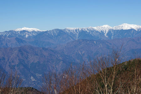 広河内岳、白河内岳などの山々を経て、塩見岳が見える。 | ![]() |