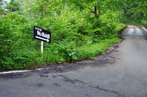やがて前方に車が駐まっており、その車を通り越してさらに進んで行くと、その車の主が林道の左下を流れる佐梨川で釣りをしていたのが見えたのであった。 これは明らかに道を間違えたと思い、林道を戻る。 宿泊客に道を聞いてしまったこと、事前によく調べてこなかったこと等、自分の愚かさを罵りながら駒の湯山荘まで戻る。 | ![]() |