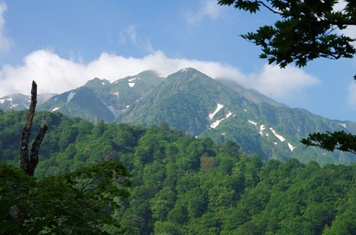橋を渡ると、すぐに急登が始まる。 やがて、右手樹林越しに残雪を抱く山が見えてきた。 | ![]() |