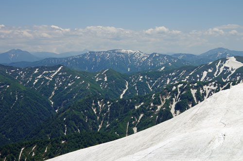 中ノ岳から右下に延びる稜線の先には、山腹にまだ多くの雪を残す御月山も見えている。