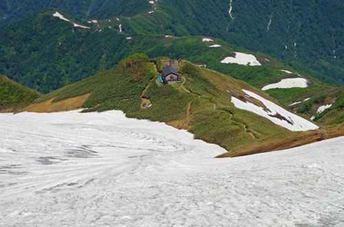 夏道からすぐに雪渓に入り、下降点まで進む。