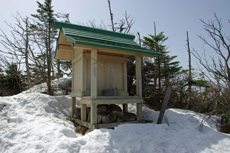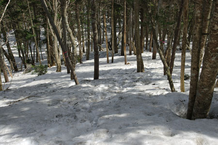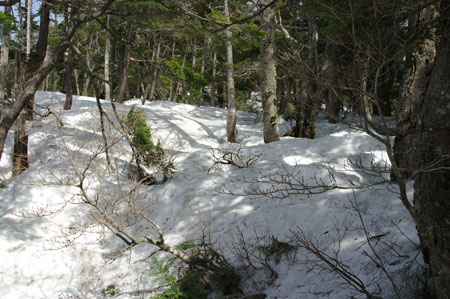 小生も戻ろうとすると、足を踏み抜き、右足が股まで潜ってしまった。何とか抜け出し、祠まで戻って、正規のルートへと進む。 |