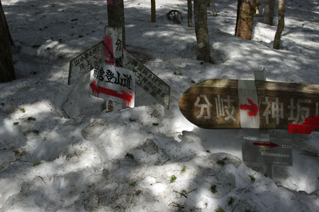 神坂ルートはここで右に曲がることになる。左に進めば修験道の面影を残す前宮ルートで、広河原ルートの開設と同じ 2001年に復活されたとのこと。