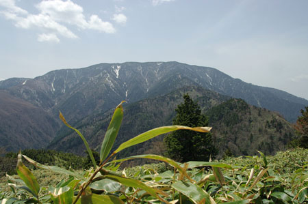 その尾根の反対側には右に下る尾根があり、この 2つの尾根が作り出すV字型の向こうに大川入山と思われる山も見える。