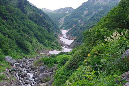 ここは雪渓を吹き渡る風が涼しく心地よい。 |