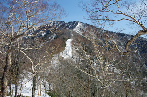やがて、雪の廊下が緩やかな下りに変わると、前方の樹林の向こうに、日留賀岳の姿が見え隠れするようになる。