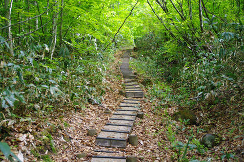 道はやがて、『 十二曲り 』 と呼ばれるつづら折りの急登となる。 ありがたいことに、この十二曲りにかかると、樹林越しとは言え、