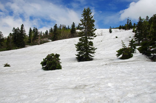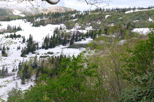 上で述べたように、 斜面の横断が終わると、土や木道が露出した場所を通ることになり、暫く先でまた残雪の斜面を横切るという行程が続く。 天候の方は、薄曇り状態。 | ![]() |
