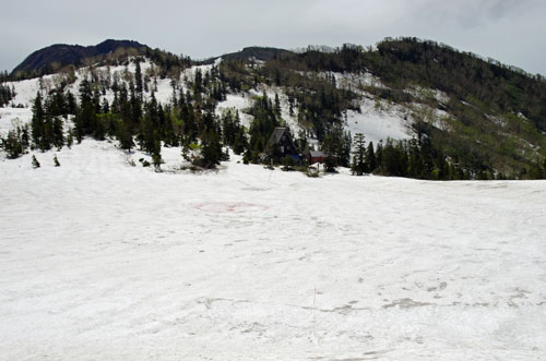 高谷池ヒュッテ、そして雪に覆われて雪原となった高谷池が見える。 進む方向に青空が見えるのに、反対側のヒュッテの方は、 相変わらず どんよりとした空である。 | ![]() |