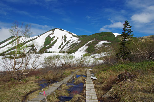 雪が融けて木道が現れている場所となる。雪解け水が周辺を流れており、春を感じさせる。 この火打山には 8年前の 1995年に登っているが、 その時の記憶では天狗の庭に沿って、木道がずっと続いていたが、今は一面の雪の原である。 | ![]() |