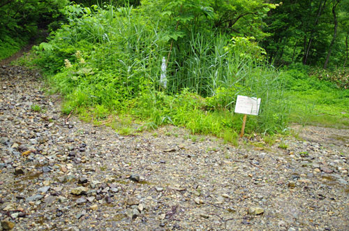 この林道歩きは結構長い。 やがて、林道に車が入ることができた頃には駐車スペースだった、と思しき場所を通過する。 | ![]() |