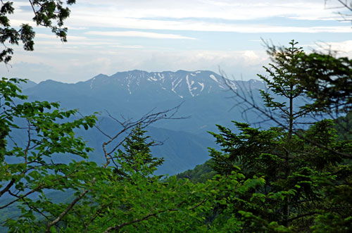 ジグザグに登って高度を稼ぐことになる。 写真の山も、その場では山の名前が分からなかったのだが、この後、 先程 避難小屋への分岐で追い抜いた方と山座同定をする機会があり (後述)、 写真左、木の葉に隠れ気味な山が武能岳、その右が白毛門、笠ヶ岳、烏帽子岳、朝日岳、 そしてジャンクションピークであることが分かる。 | ![]() |
