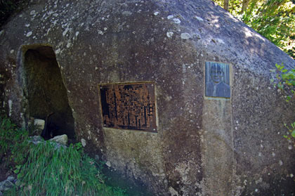 まず、この岩は五丈岩。この場所は駒ヶ岳神道の修験行者植松嘉平治が人力で彫った祈祷所であること。