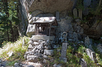 目の前には屏風岩。張り出して庇のようになった岩の下には祠が祀られている。