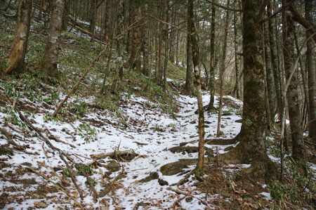 | 3. 長い林道を登り終え、沓切沢橋を渡るとようやく登山口。時刻は    7時37分。 山道はこんな感じで雪はそれほど多くない。 |