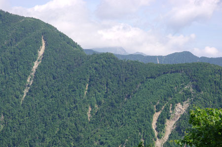 もう少し目を左 (北西) に向ければ、先程 樹林越しに見えた白峰南嶺の稜線をハッキリ見ることができる。 また、写真のように崩壊は足下だけではなく、 さらに高い所まで進んでいる。 | ![]() |