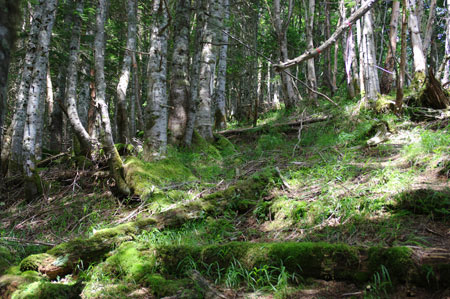 ![]() | 苔むした場所を過ぎると、周囲は青空が見える道となり、木々の間から前方に高みも見えるようになってきた。 あれが目指す黒河内岳であろうか。 道は再びシラビソの林の中に入る。先程までの細いシラビソの林に比べ、