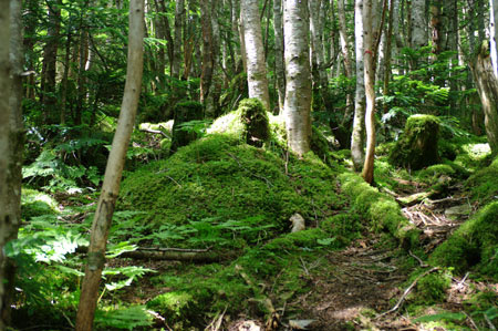 歩きながら、船窪のようになった左下を見ると、水溜まりも見える。しかし、水の色は赤さび色。これでは動物達も飲まないであろう。 さらに進むと、周囲の苔もかなりビッシリとした状態になってきた。 | ![]() |