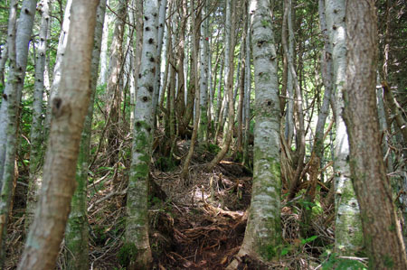 剥き出しになった根に足を引っかけないようにしてシラビソの間を抜けていく。 |