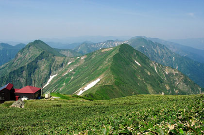 やがて、左下に肩の小屋、そしてその向こうに万太郎山とそこへと続く稜線をハッキリ見ることができるようになった。