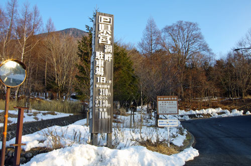 左手を見れば中禅寺湖、 そしてその向こう岸に社山の姿が見える。 県営湖畔駐車場の建物を過ぎ、建物横の駐車場への入口となる道路を曲がる。 | ![]() |