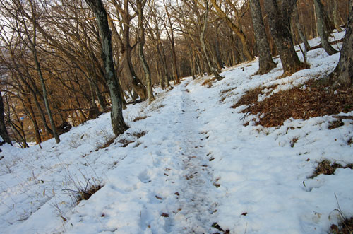 道は明瞭、雪の上に踏み跡もしっかり残っており迷うことはない。 すると、すぐに目の前に入山禁止の立て札が現れる。 しかし、ここは目をつむってもらい通過させてもらう。 |