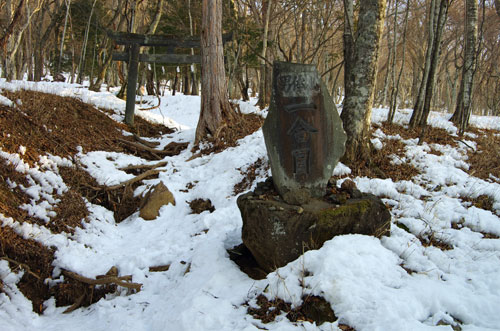 右に曲がって階段を昇る。 石の鳥居を潜り、雪の上の踏み跡を辿る。 |