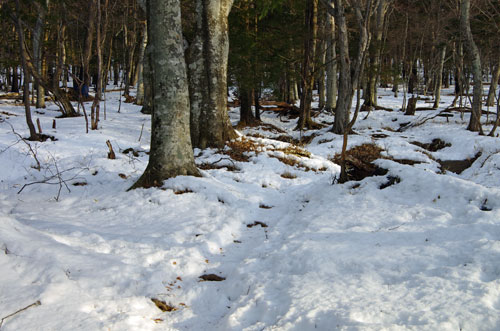 雪は締まっていて歩き易く、アイゼンは不要であるが、この後 本格的な登りになったら途中でアイゼンを装着するのは難しいかもしれないと考え、