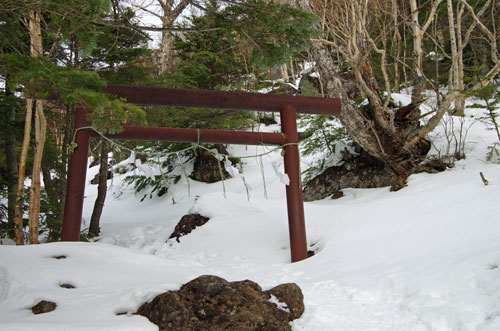 雪が多く積もっていて登山道がかなり嵩上げされているので、腰をかがめる必要がある。