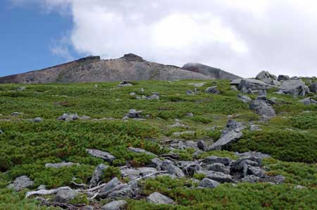 やがて、傾斜も緩やかになり、ハイマツの背丈もかなり低く、足下には高山植物が目立つようになる。
