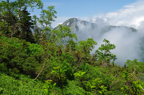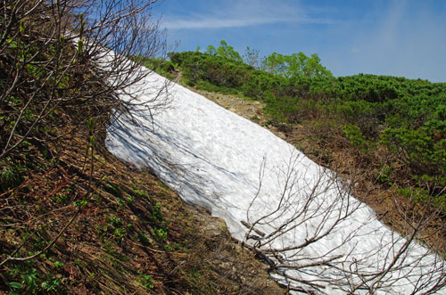 ![]() | キヌガサソウが両脇に多く咲く道を登り切ると、展望が開け、振り返れば大滝山が見えるようになる。 そして、すぐに雪渓を横切ることになる。結構 急な斜面を横切るにも拘わらず、