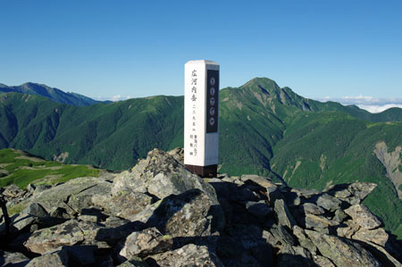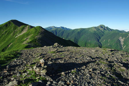 | 5. 順調に足を運び、広河内岳頂上には 6時30分に到着。    当然誰も居ない。ここでも本日一番乗り、非常に嬉しい。       ここからの景色も素晴らしく、先程 農鳥岳頂上から見た塩見岳、    荒川三山、赤石岳といったスター軍団に加え、白峰南嶺と呼ば    れる峰々が遠く笊ヶ岳の双耳峰の方へと続いている。 | 6. 左側から延びた尾根が少し左に曲がるピークが白河内岳、その    左側に見えるのが黒河内岳(笹山)と思われるがどうであろうか。    昨日、農鳥小屋で一緒になったご夫婦に、この白峰南嶺縦走を    しきりに勧められたが、確かに魅力的な稜線が続く。    特に、黒河内岳は山梨百名山にもなっているようなので、その    頂上に立ってみたいものである。 |