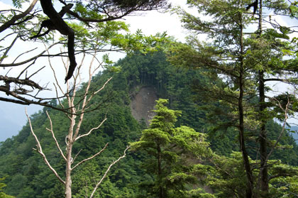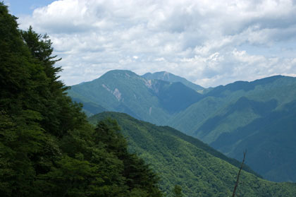 小無間山の登りに取り付く。 少し高度を上げて振り返ると、視界が開け、いわゆる白峰南嶺の山々が見えてきた。 恐らく大きくどっしりとしている山が青薙山。 その右後方に見えるのが稲又山、布引山で、青薙山の右手に見えるのはイタドリ山と思われるがどうであろう。