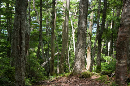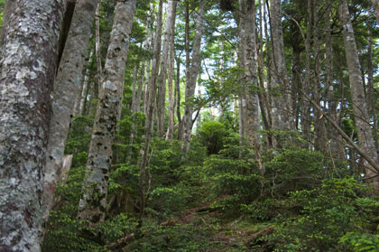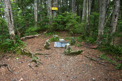 そして崩壊地のコルから登り続けること 55分、徐々に傾斜が緩やかになり、12時57分、小無間山頂上に辿り着いた。 頂上は狭く、周囲はシラビソ等の樹林に囲まれて全く展望はない。標識があるから小無間山頂上と分かるが、 そうでなければ先ほどまでにいくつか越えてきたピークの一つと言っても分からないであろう。