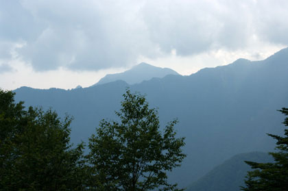 1,796m三角点にある岩に腰掛け休憩を取りながら大無間方面を眺める。 大無間山からの稜線の向こうに朝日岳の姿が見える。それにしても大無間山は遠い山だ。