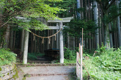 階段を下り、林道を横切って杉林の中を下る。 そして 16時29分、諏訪神社鳥居前に到着。鳥居手前にコンコンと湧き出ている水の美味かったこと。 本当にくたびれた。