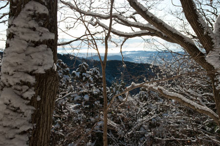 4. 雑事場には 8時10分に到着。すぐに見晴茶屋。    この茶屋の前からは秦野の町並み、相模湾がよく見える。    ここから急登が始まる。しかし雪のためか、それ程きつく感じない。 |