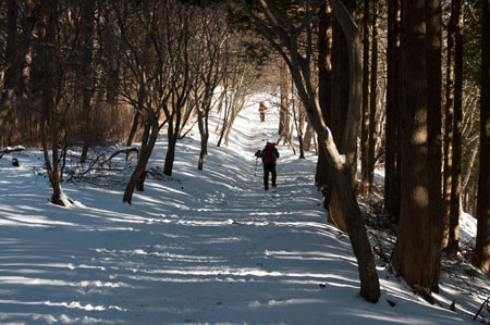 2. 車道を進み、途中から山道に入る。思ったよりも雪は少ない。    但し、時折 木から雪が落ちてくるのには閉口する。 |