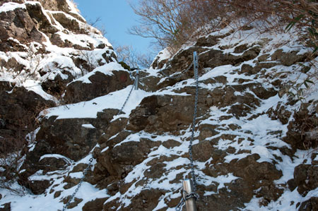 2. 順調に進んで行者岳への登りとなる鎖場に至る。    写真の様に、鎖は雪に埋もれてはおらず、また斜面も凍っていな    いので、ほとんど問題なく通過。 |