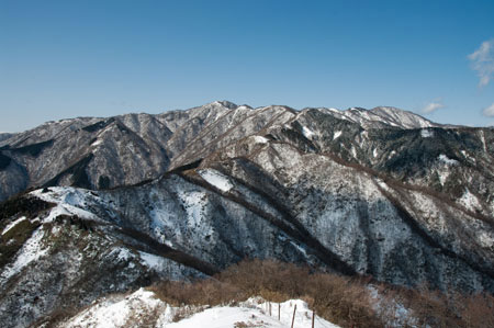 | 5. 案の定、烏尾山から下って登り返す三ノ塔はきつかった。    おまけに、斜面に雪が多く、少々苦労する。ようやく登り着いて    振り返れば、塔ノ岳を頂点とするここまでの道程が一望できた。    よくもまあ、歩いてきたものである。 |