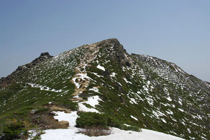 鞍部に下り着いて振り返れば、東天狗の緑の斜面に残る雪が鹿の子斑 (まだら) を作っていてなかなか美しい。