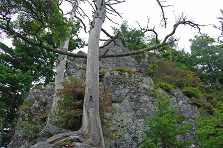 何となく直登できそうな気がする。前回は直登を避け、テープに従って岩の右手から回り込んで岩峰の上に立ったのだったが、