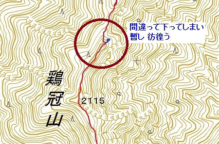 小生はその肝心な分岐ポイントを見逃してしまい、そのまま右斜面を大きな岩の所まで下ってしまったという訳である。