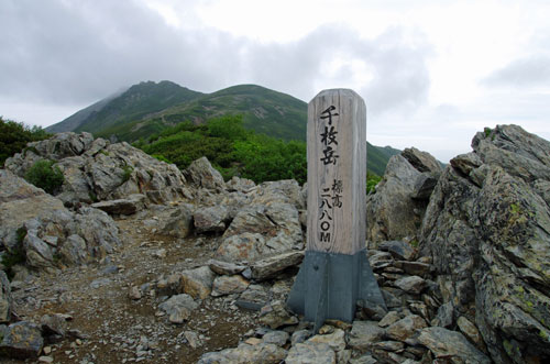 千枚岳頂上で 5分程休憩した後、千枚小屋へ向けて出発する。 |