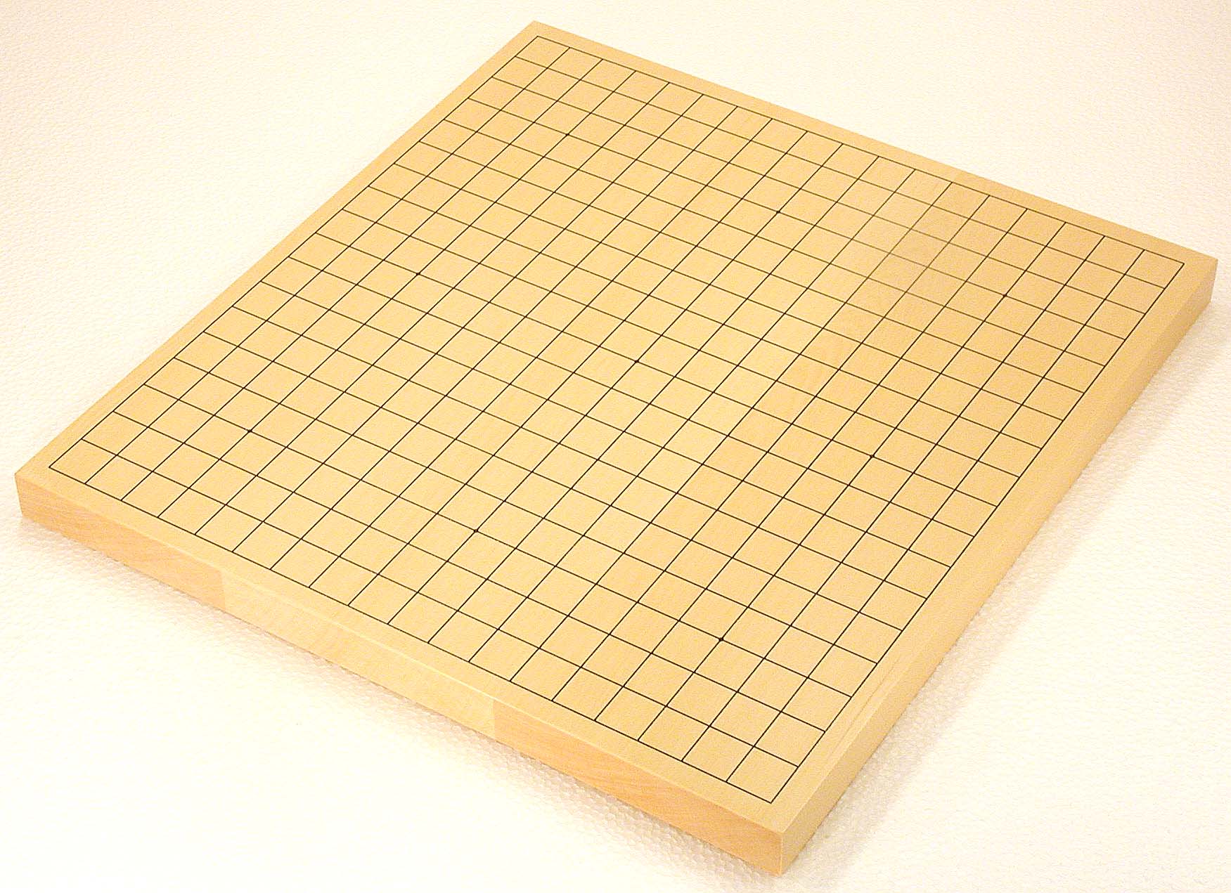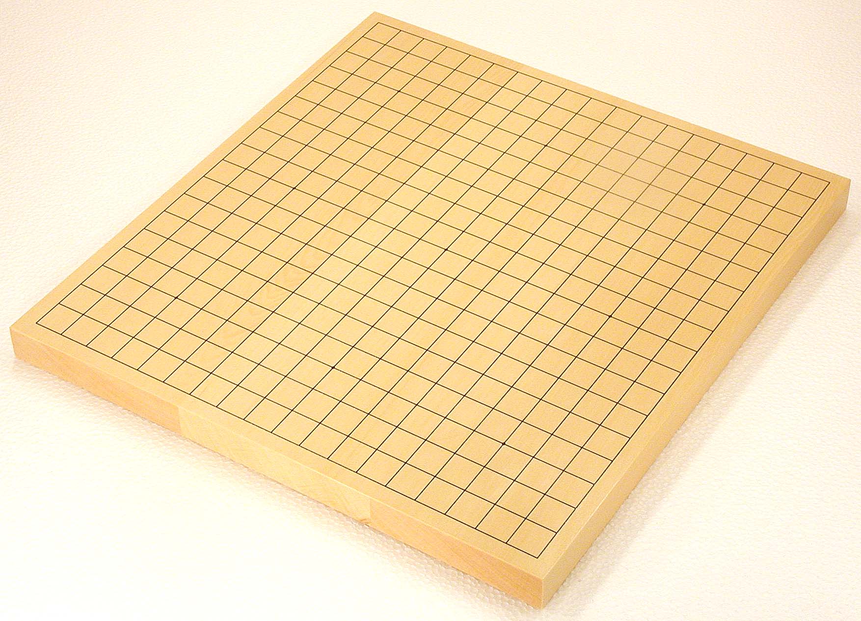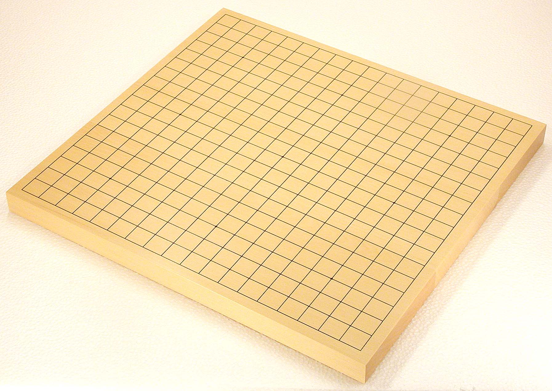 碁盤/ひば材/1寸/柾目継ぎ(特上) 生地は、細やかできれいな柾目(まさめ)継ぎの仕上げです。盤の厚さは約3pです。 ¥16,000(税込み) (写真内の 碁盤の線 が屈折したり、点々と光っているのは、撮影用の照明ライトの反射です) |