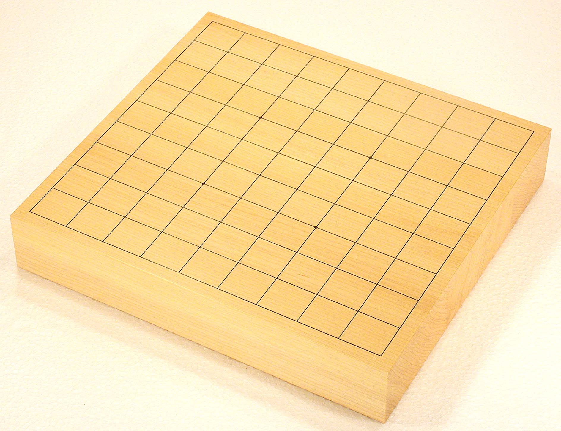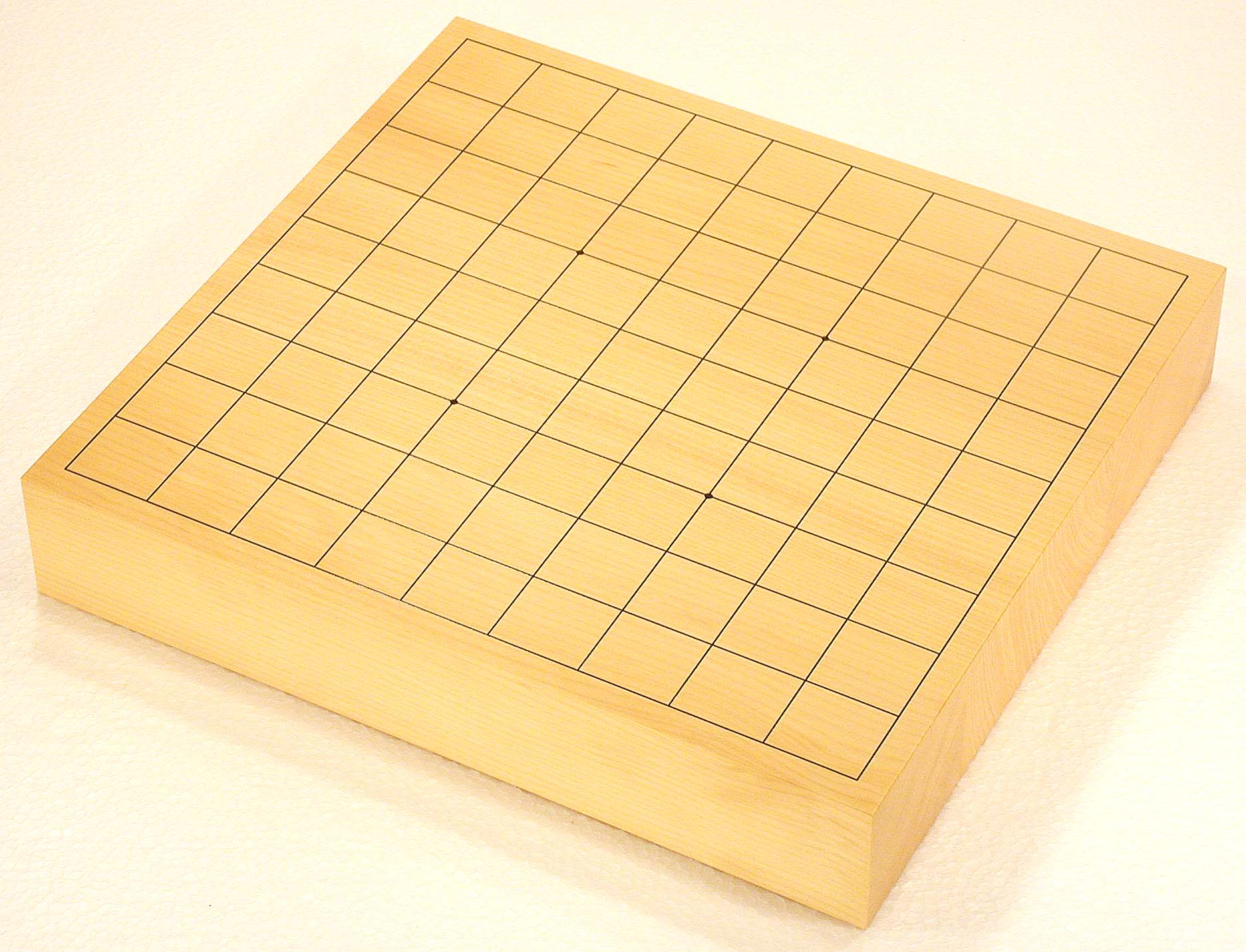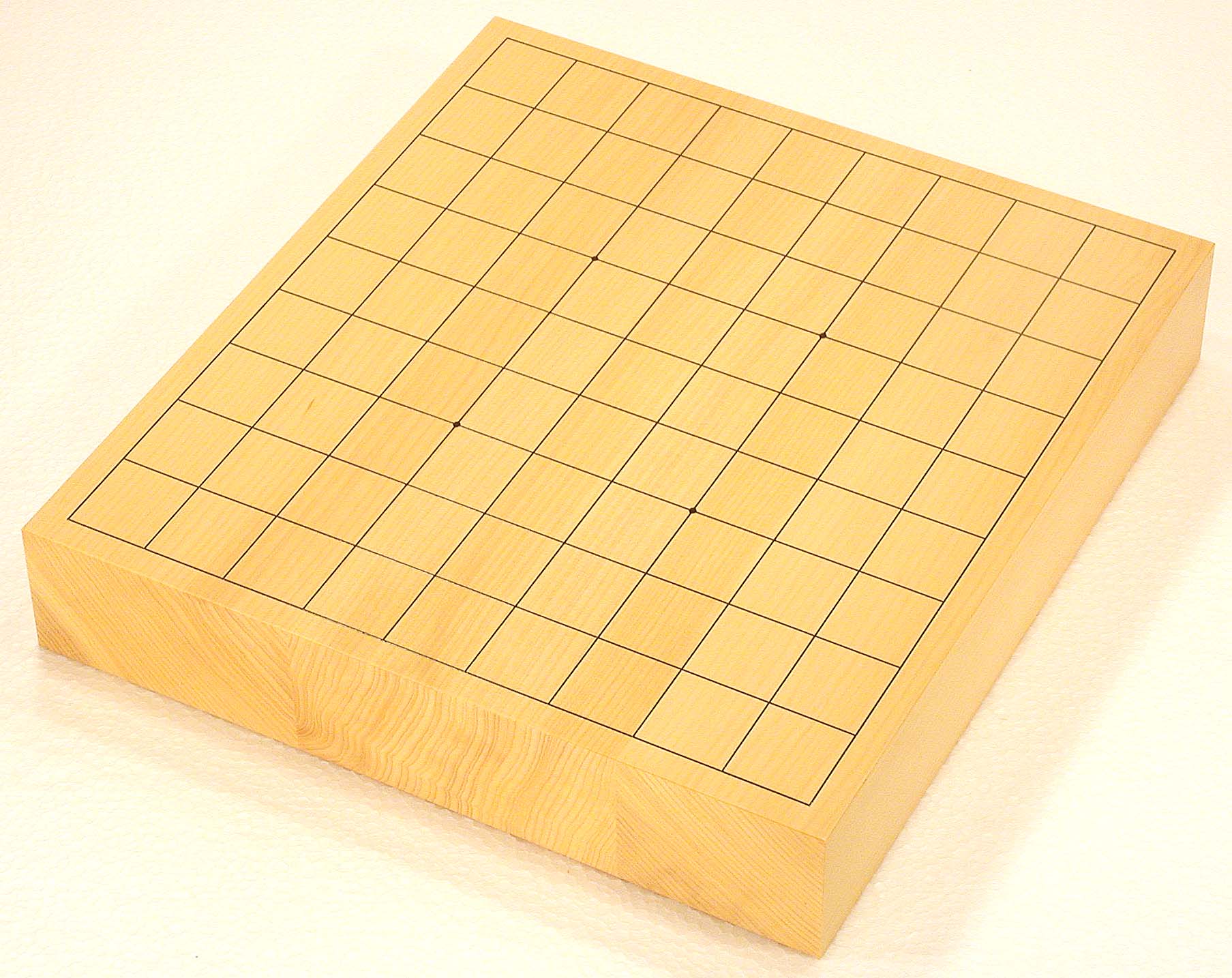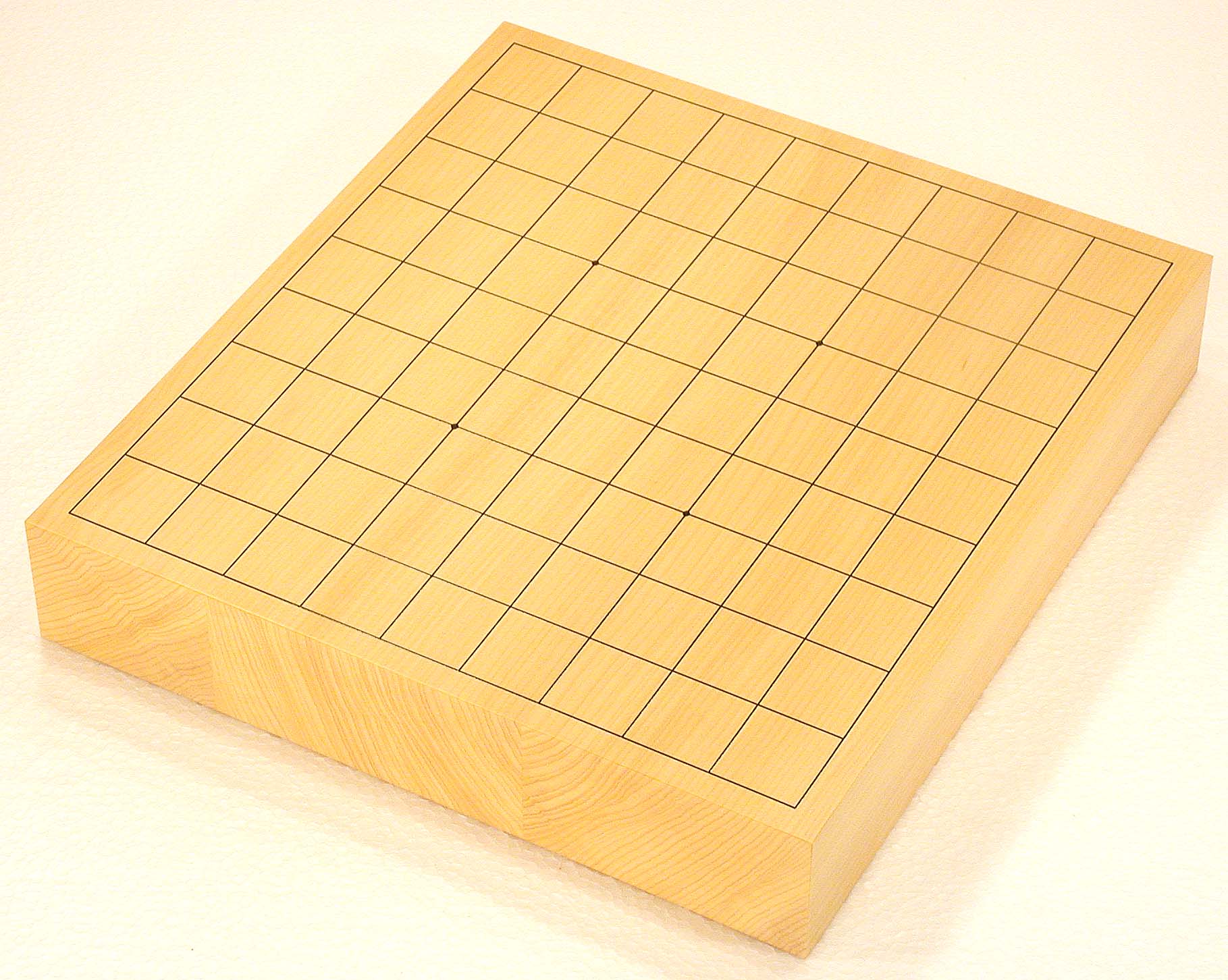 No.575:Torreya nucifera (KAYA) Table Shogi Board, 2-sun (6 cm thick of the board) Basic grain descriptions and types include: "MASAME" straight - grain which runs in a single direction, parallel to the axis of the tree. This is some pieces composition board. The most valued boards are made from "kaya", which is a mellow yellow. Front |