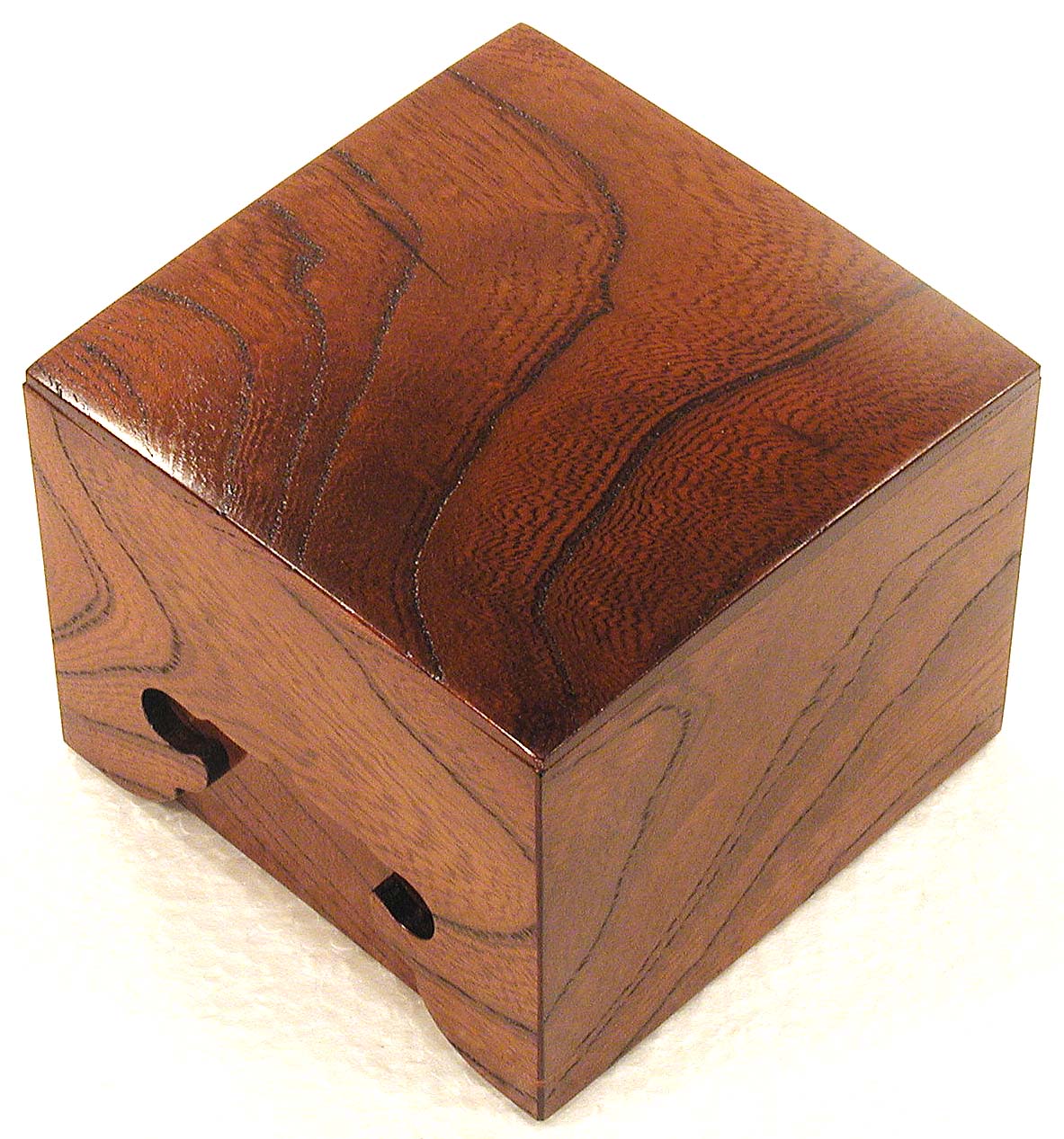 駒箱/神代欅(けやき) 材(漆拭き仕上げ)( No.60 ) ( 松浦清治 製作 ) サイズ:たて/10,2cm・よこ/10,2cm・高さ/7,8cm ¥36,000(税込み) (写真内の 駒箱の面 が点々と光っているのは、撮影用の照明ライトの反射です) |