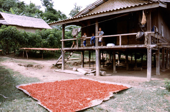 天気のいい日は、村のあちこちで唐辛子を干している。 ゲオ・パトゥー村