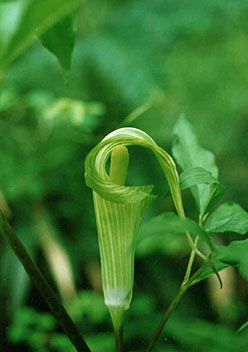 近場にあったマムシグサ(?)はいずれも包の部分が紫がかっていましたが、この株は白っぽい緑です。