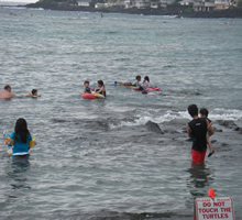 | ▲クキオ・ビーチ。後に岩場 | ▲クキオ・ビーチに海亀クン登場 | ▲妙さんも水に浸かって |